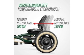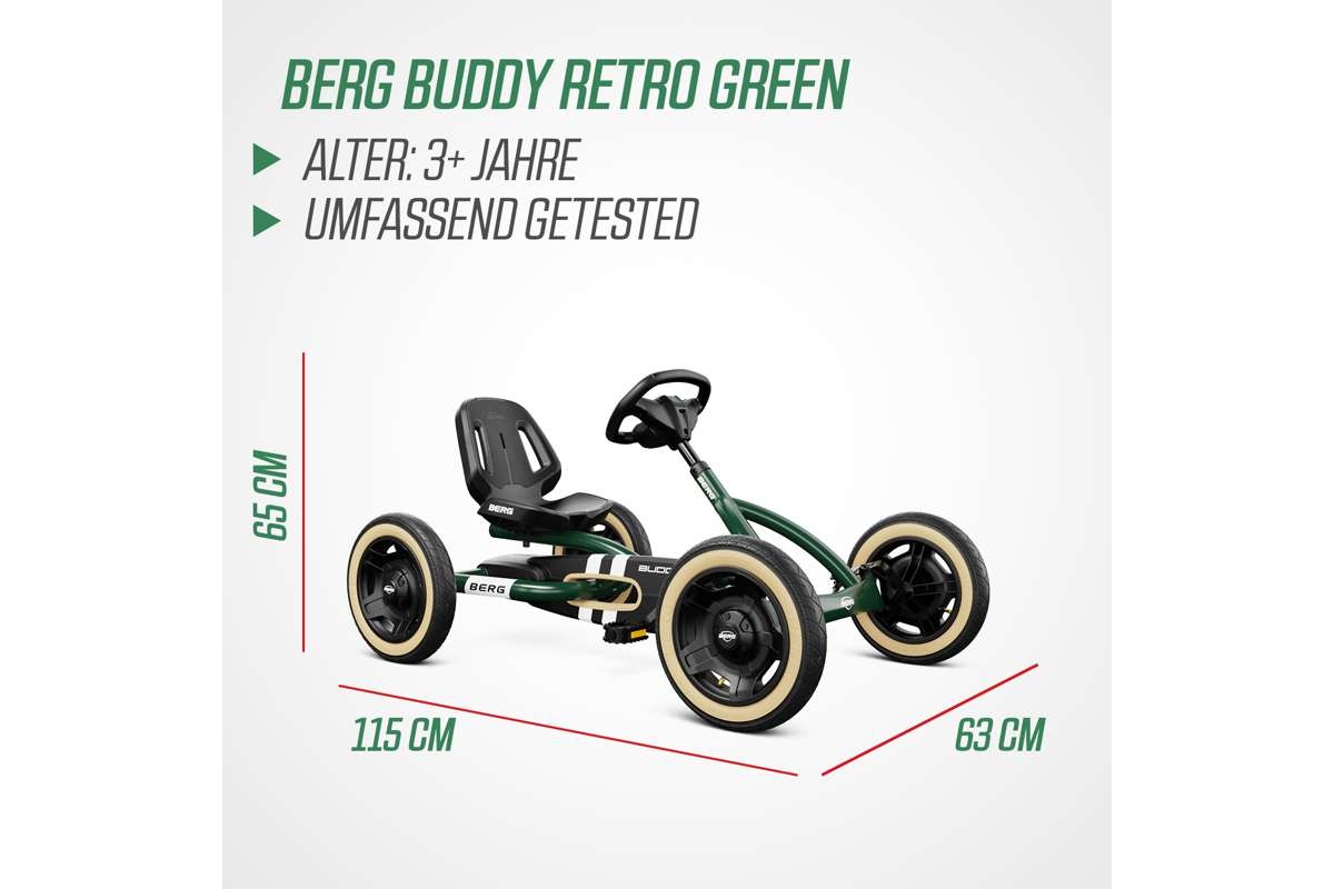 Trotz seines klassischen Aussehens verfügt der BERG Buddy Retro Green über modernste Go-Kart-Technologie, einschließlich des innovativen BFR-Systems und einer Pendelachse. Das BFR-System ermöglicht es dir, vorwärts zu treten, mit der Rücktrittbremse zu bremsen und nach einem Stopp sogar rückwärts zu treten. Dank der Pendelachse bietet das Go-Kart stabile Fahrten auf jedem Untergrund. Der verstellbare Sitz wächst mit dir mit, sodass du jahrelang Abenteuer in Stil genießen kannst.Warum den BERG Buddy Retro Green wählen?