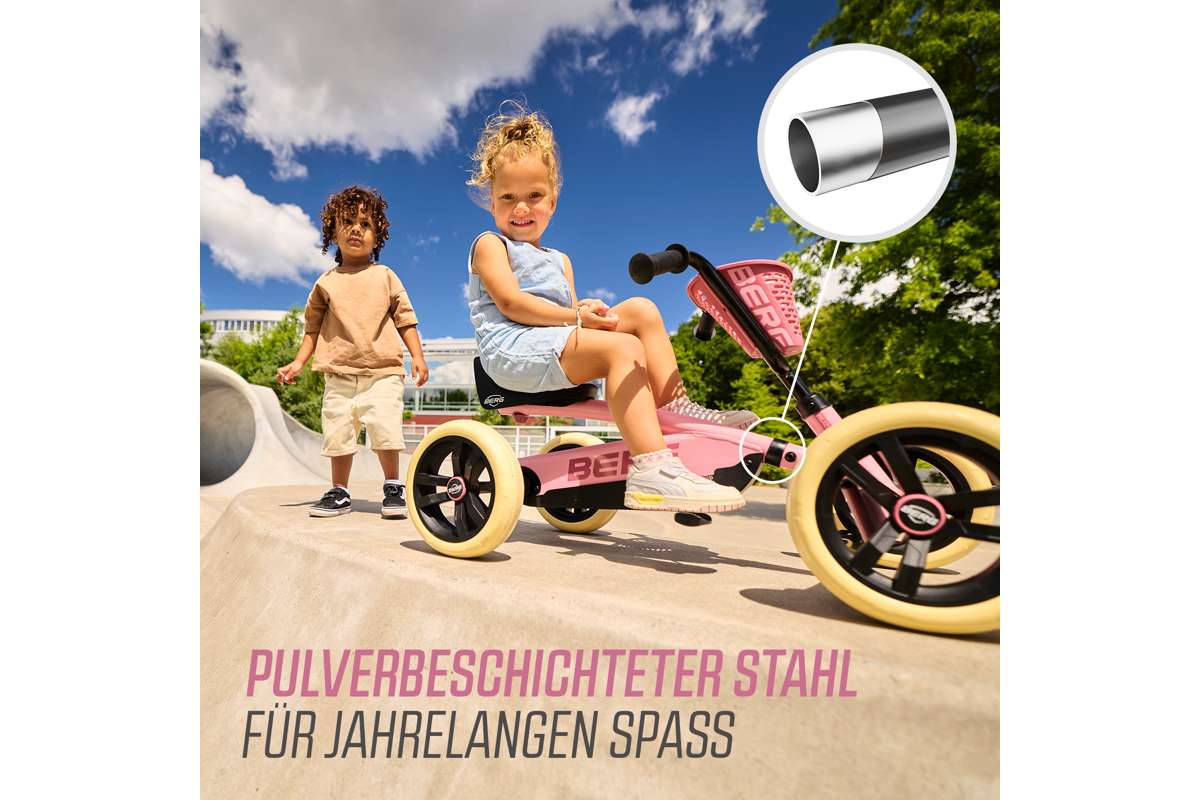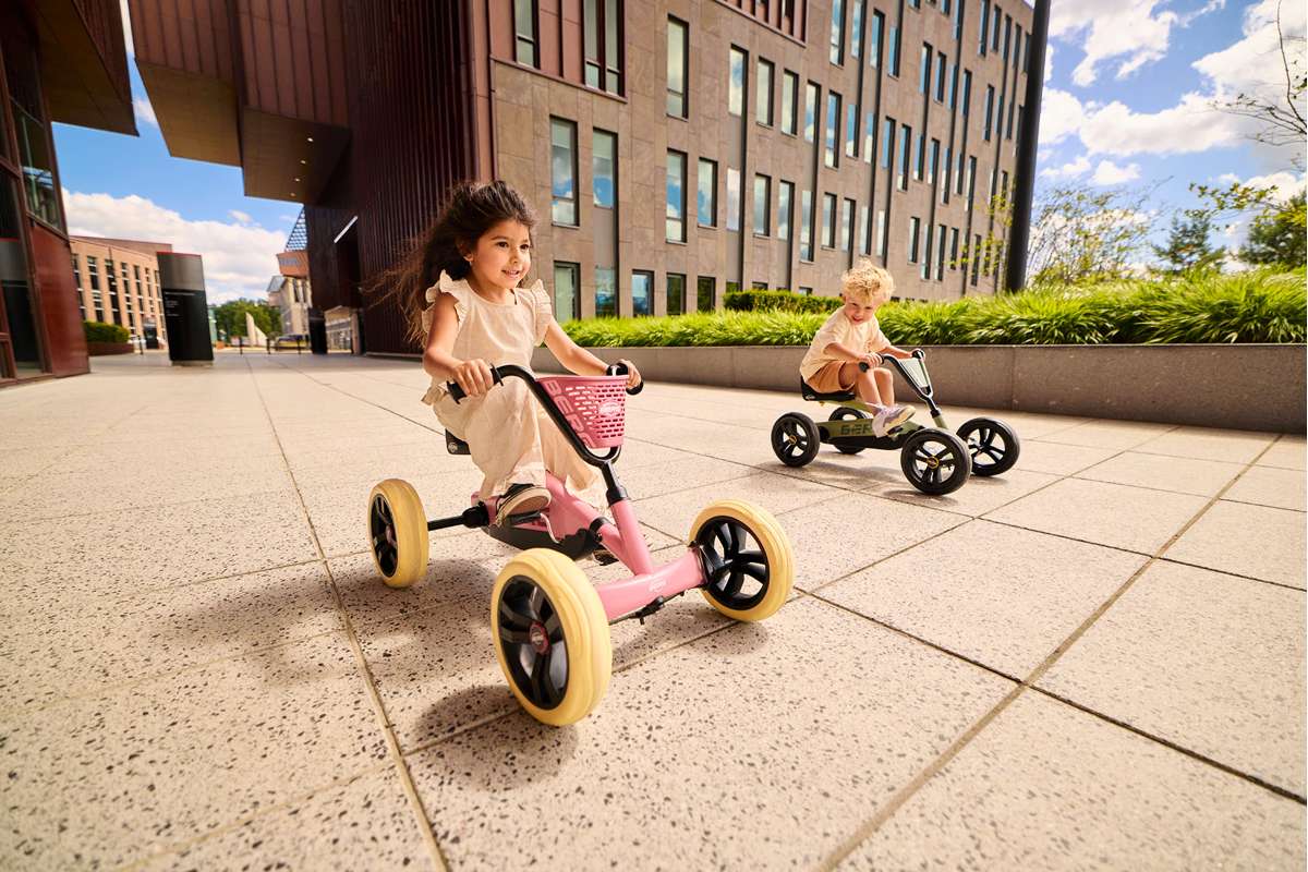 Das BERG Buzzy Gokart ist dank seiner vier Räder viel stabiler als ein Dreirad und somit auch viel sicherer! Und die Füße bleiben auch in den engsten Kurven fest auf den Pedalen, weil die Pedale nicht wie bei einem Dreirad mit dem Lenker verbunden sind. Das macht das Treten der Pedale viel einfacher und du wirst wie ein echter Rennfahrer über die Straßen flitzen. Und rückwärts geht es genauso schnell!