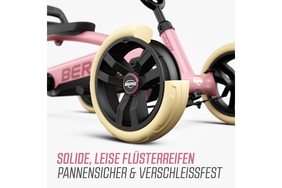 Die vier Massivreifen und die Pendelachse halten den BERG Buzzy fest am Boden. Auf dem Buzzy meistert dein Kind jedes Gelände.