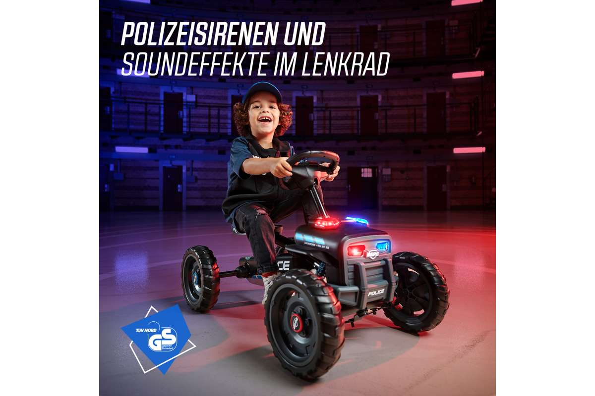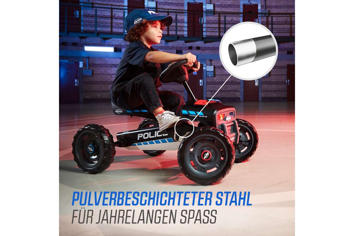 Dank seiner vier Räder ist der Buzzy Police von BERG viel stabiler als ein Dreirad. Das ist super sicher! Außerdem liegen deine Füße auch in den schärfsten Kurven fest auf den Pedalen auf, weil die Pedale nicht mit dem Lenker verbunden sind. Dadurch wird das Treten der Pedale viel einfacher, und du wirst über Trottoir oder Asphalt regelrecht hinwegzischen. Und rückwärts geht‘s genauso schnell!