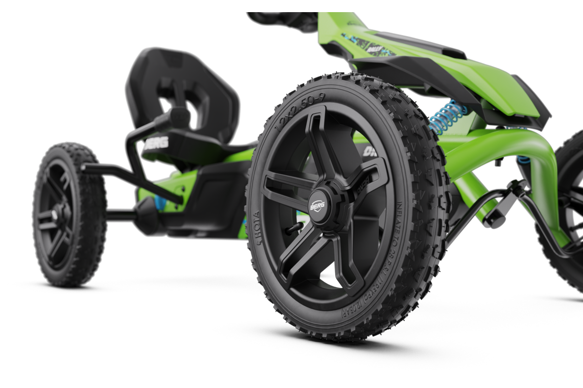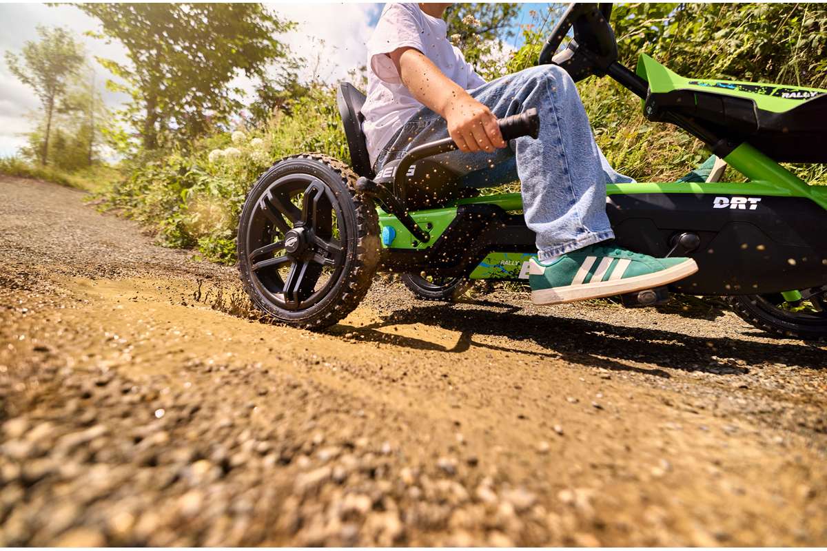 Möchtest du dich in unwegsamem Gelände austoben? Der Rally DRT Green ist mit stoßdämpfenden Geländefedern ausgestattet.