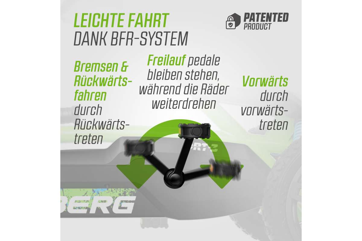 Dank Luftreifen und Pendelachse steht hier der Komfort im Vordergrund. Einfacher Wechsel zwischen Vorwärts- und Rückwärtsfahrt dank BFR-System. Eine Feststellbremse sorgt für sicheres Anhalten. Der verstellbare Sitz sorgt dafür, dass Dein BERG Rally Gokart viele Jahre lang mit Dir mitwächst.
