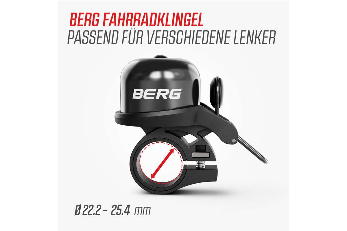 Die BERG Fahrradklingel montierst du im Handumdrehen am Lenker deines BERG (Lauf)rads. Dank des klaren, lauten und langlebigen Klangs bist du immer gut hörbar und sicher unterwegs. Die Klingel ist sowohl für Links- als auch für Rechtshänder geeignet und lässt sich einfach an Lenkern mit einem Durchmesser von 22,2 bis 25,4 mm befestigen.