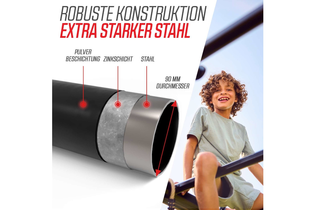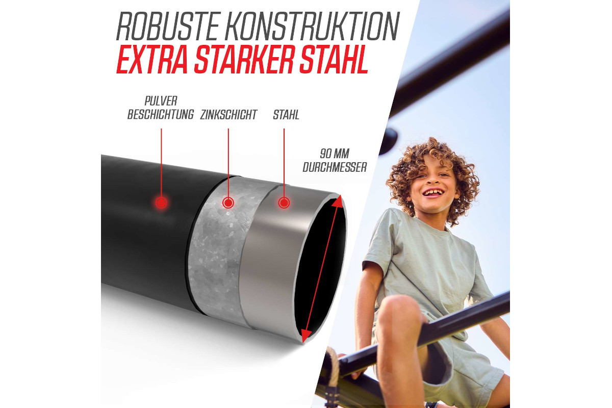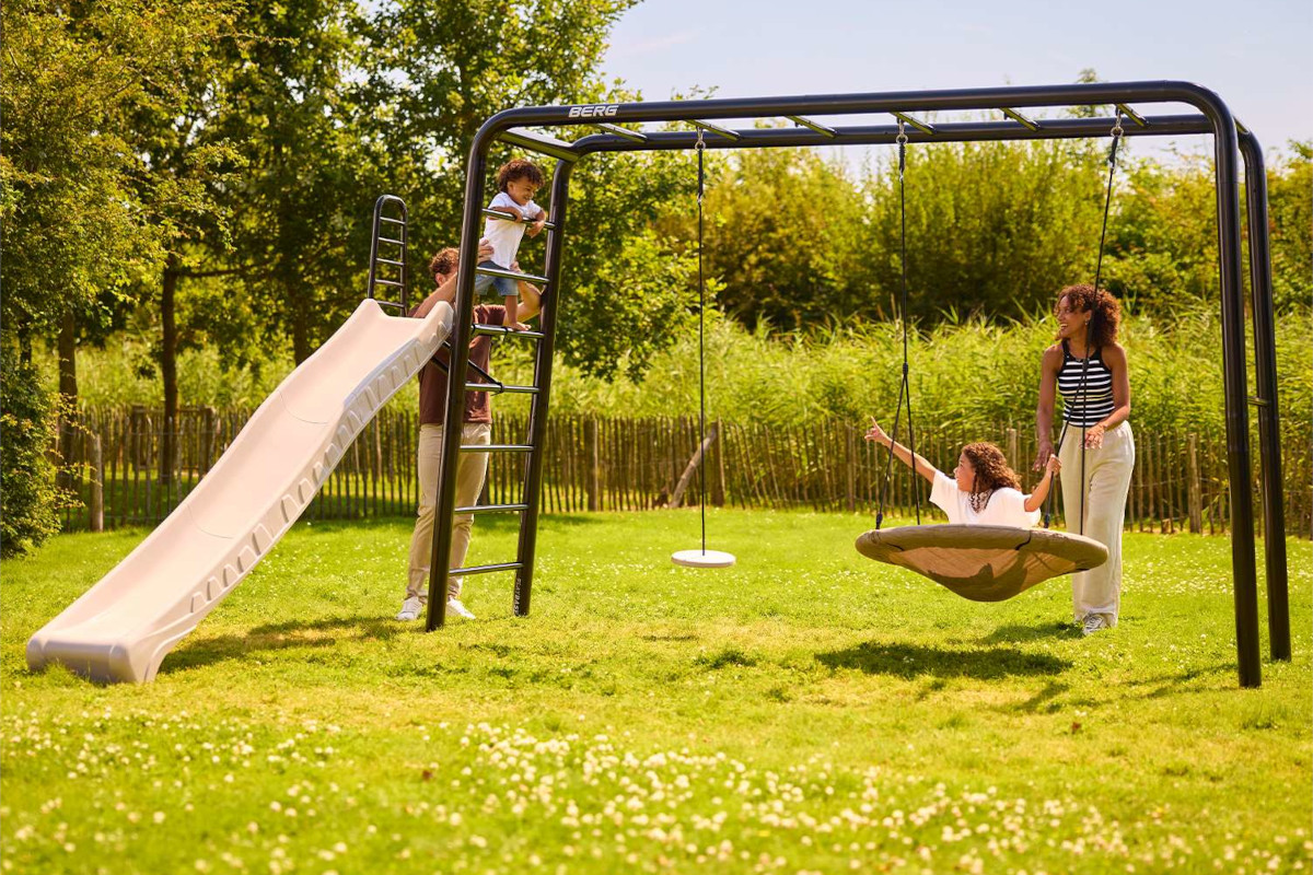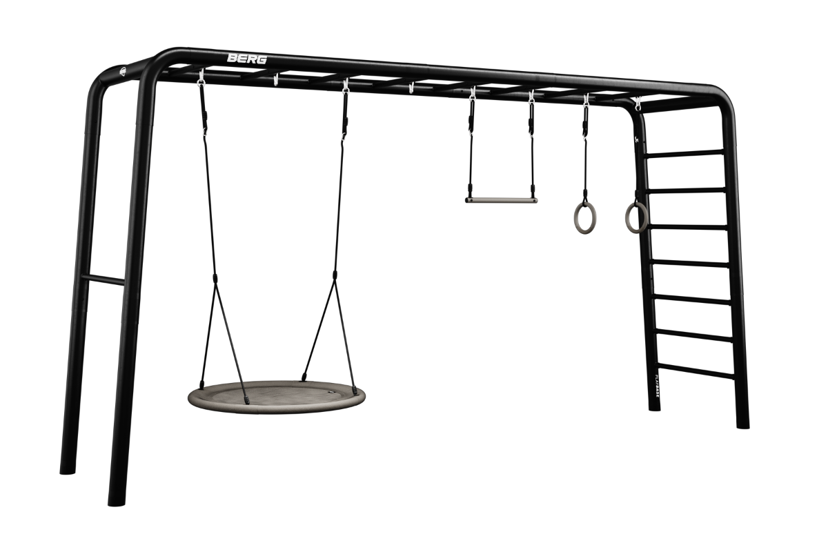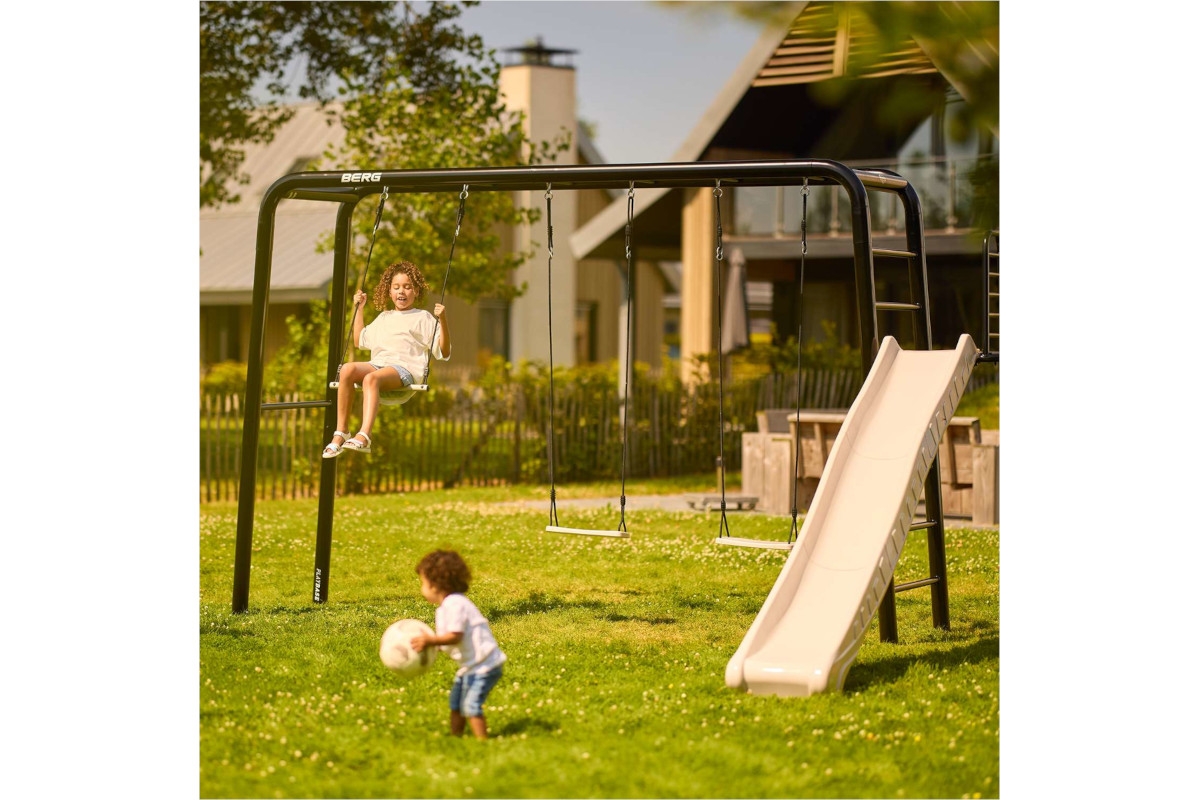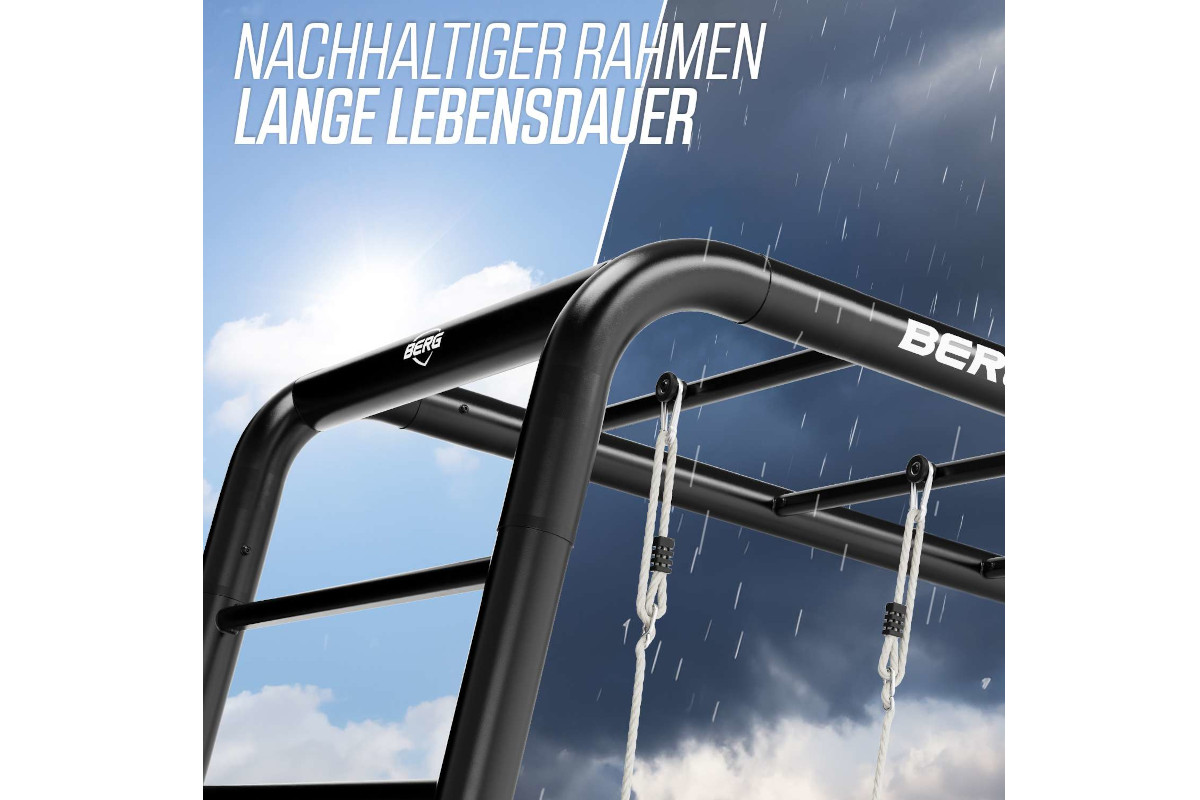 Die BERG PlayBase ist nicht nur funktional, sondern auch ein Hingucker in deinem Garten. Der Rohrdurchmesser des schlanken schwarzen Rahmens beträgt 89 mm, mit einer Wandstärke von 1,5 mm. Das macht den Rahmen äußerst robust und geeignet für sorgenfreie Nutzung das ganze Jahr über. Der schlanke schwarze Stahlrahmen, kombiniert mit den modernen und natürlichen Farbakzenten der Accessoires, verleiht deinem Garten eine minimalistische Optik, die perfekt in jeden modernen Garten passt.Der kompakte, verzinkte Rahmen benötigt im Vergleich zu anderen Spielgeräten wenig Platz, da der größte Teil der Stabilität durch die unterirdische Verankerung erreicht wird. So bleibt der offene Charakter deines Gartens erhalten, während du dennoch ein komplettes Spielgerät genießen kannst.