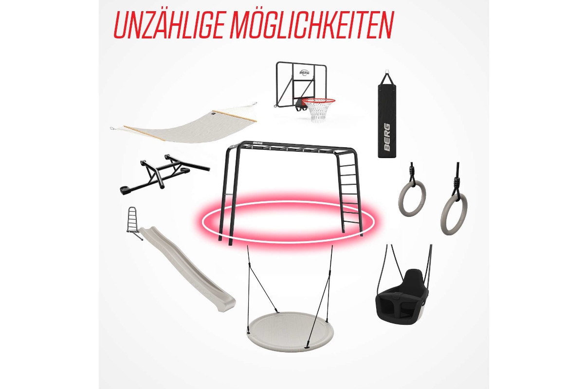 Der Rahmen der BERG PlayBase ist als multifunktionale Plattform konzipiert, die dir unzählige Möglichkeiten bietet. Möchtest du trainieren? Dann wähle Zubehör wie eine Klimmzugstange oder einen Boxsack. Für Kinder gibt es eine Vielzahl an Kletter- und Schaukelzubehör, wie eine Kletterwand und verschiedene Schaukeln. Und möchtest du dich nach einem aktiven Tag einfach entspannen? Hänge einfach eine Hängematte auf und genieße deinen Garten.Einfache Installation ohne Beton
